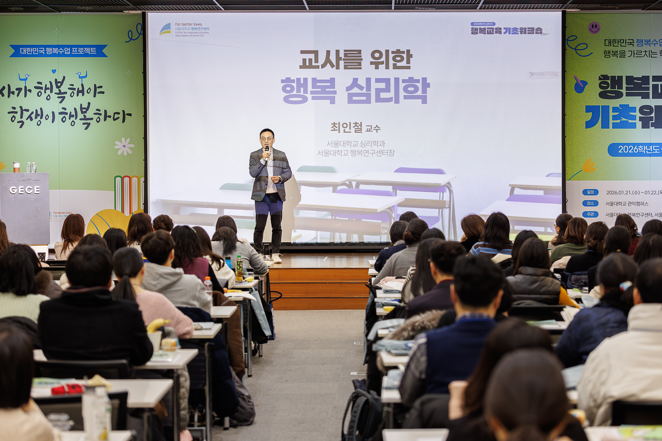서울대학교 행복연구센터는 2010년부터 행복을 주제로 한 연구를 지속하며, 행복심리학에 기반한 교육 확산에 힘써오고 있다. 이번 워크숍 역시 공문을 통해 신청한 교원, 동료의 추천으로 참여한 교원, 동료 교원과 함께 연수를 듣기 위해 동행한 교원 등 다양한 경로의 참여자들이 모였지만, ‘행복을 배우고 이를 학생들에게 어떻게 전할 것인가’라는 공통의 질문을 안고 한자리에 모였다.