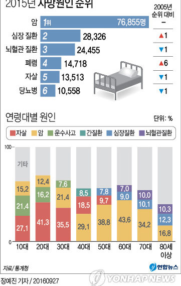 그림. 통계청이 2016년에 발표한 사망자수와 사망원인 통계자료를 연합뉴스에서 편집한 것이다.