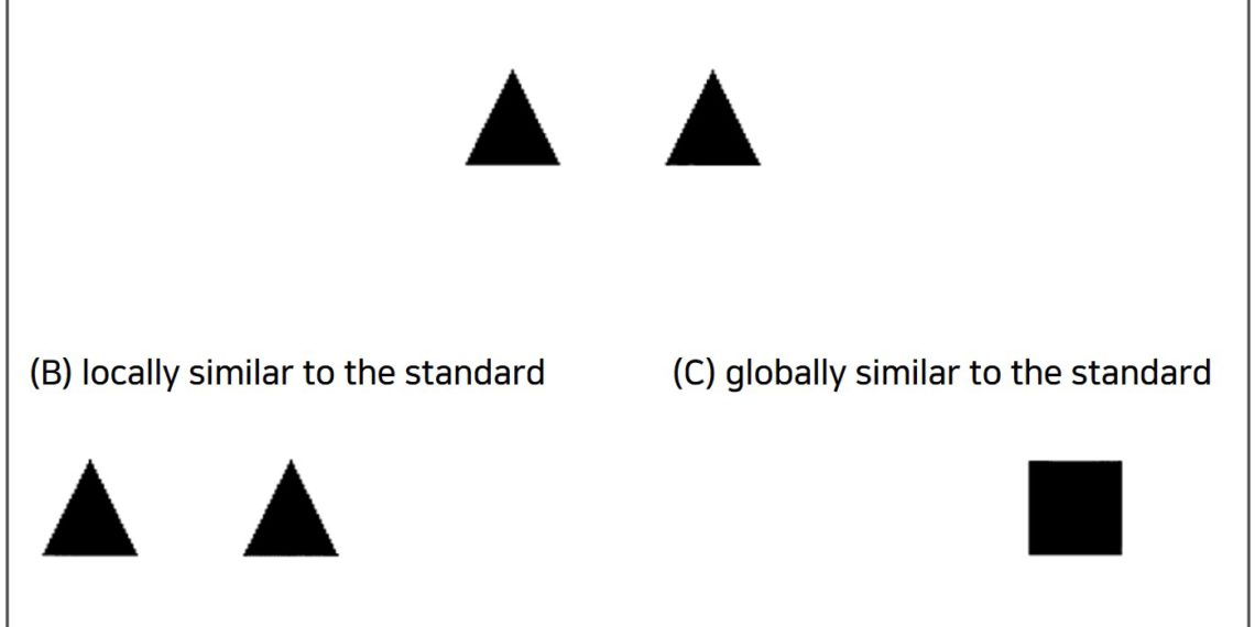 구체적으로 그림-1A와 같은 기준 자극을 본 후, 아래의 두 그림 중 어느 것과 더 유사한지 선택하도록 한다. 이때 주의가 전역적으로 유도된 사람들은 전역적 형태가 삼각형으로 같은 우측(그림-1C)의 것이 더 유사하다고 판단하겠지만, 주의가 국소적으로 유도된 사람들은 국소적 도형이 삼각형으로 같은 좌측(그림-1B)의 것이 더 유사하다고 판단할 것이다.