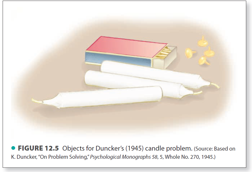 그림 . Dunker(1945)의 창의적 문제해결 과제의 도구를 보여준다. 문제는 “위의 도구들을 활용하여 벽에 양초를 붙이고 불이 붙이되, 촛농이 바닥에 떨어지지 않게 하는 것”이다. 정답은 본문의 뒤의 부록에 있다.
